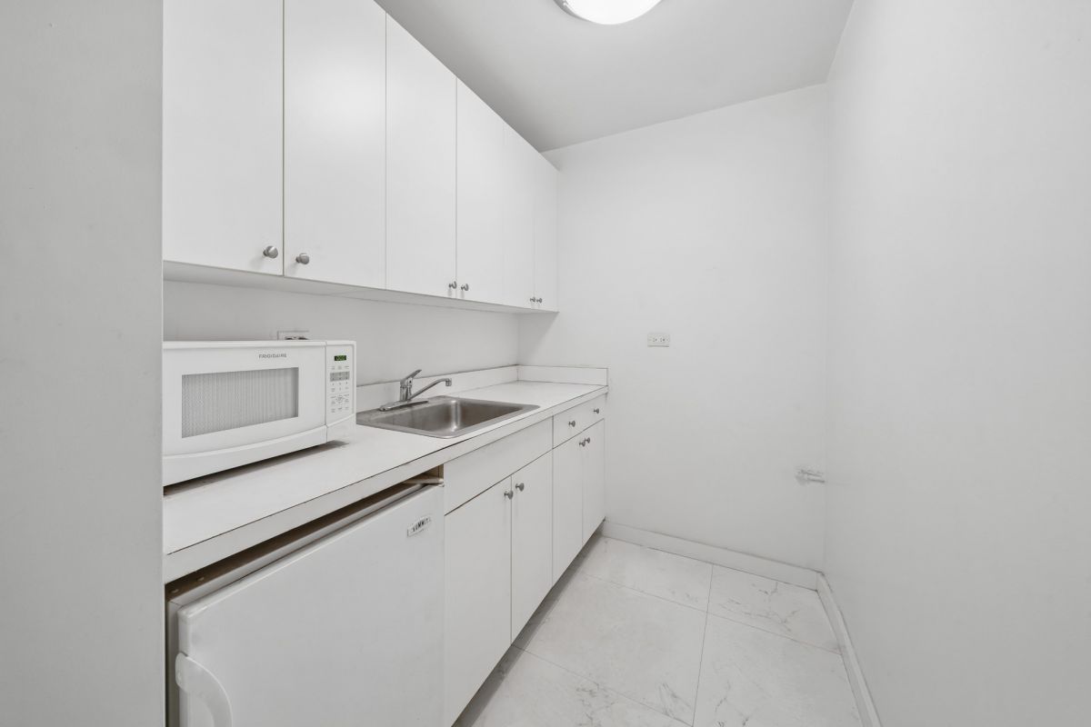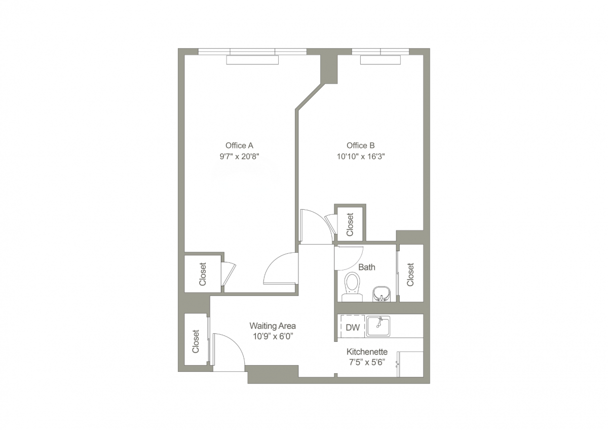 Well-designed private office space featuring two office suites, a dedicated waiting and reception area, private restroom, and convenient kitchenette. Large windows throughout provide excellent natural light, creating a bright and comfortable environment for clients and staff alike. Available as a full opportunity or single office space (Office A). Ideal for medical, wellness, or general professional use, seeking a move-in-ready space with a practical, efficient layout.