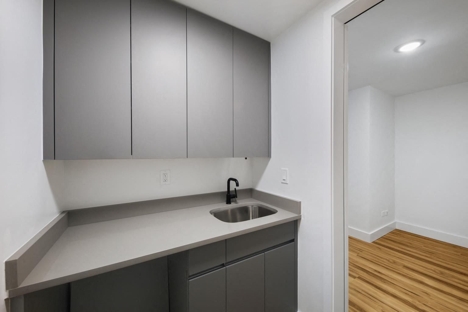 Bright and well-appointed suite featuring one private office, a welcoming reception and waiting area, a private restroom, and a small kitchenette.