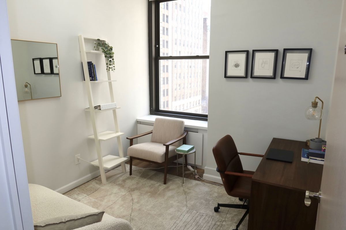 Available for psychologists, therapists, and other health professionals, a practice at 185 Madison Avenue in Midtown Manhattan has office space available for rent in a conveniently located, well-maintained, well-lit doorman building, within a sophisticated, newly renovated office suite. The rest of the offices in the suite are occupied by a community of other clinicians, making cross referrals simple and seamless. Sublet terms negotiable. The office has a large window with a beautiful view of the empire state building and midtown. Other amenities include cleaning services, wifi, communal kitchen, access to a group room, quiet waiting room, buzzer doorbell, furnishing (couch, desk, shelf, rug, mirror, and wall art), sound proofing, utilities, well maintained bathroom, calming office decor. Office space is within easy walking distance of the 6 train, Penn station, and Grand Central Station. The office will rent for $110 a day on either Monday or Friday (or both). Contact for more information and photos: emily.small@hamlettherapy.com