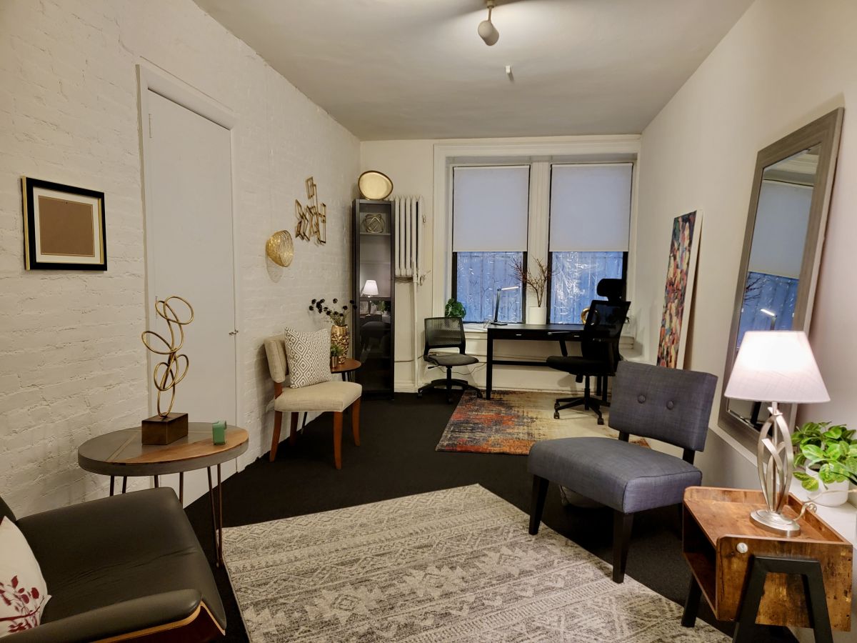This office is located on a quiet treelined street in the heart of the Upper West Side. Located in the basement of the building with two windows facing internal surroundings provides natural light with privacy. The lobby is calm and peaceful to give yourself and your clients a professional environment. The office is available unfurnished or partially furnished (as shown, except for the large abstract painting). Can be approved for subletting and space sharing if needed. Lease is $1,050.00 for one year with 3 months free.