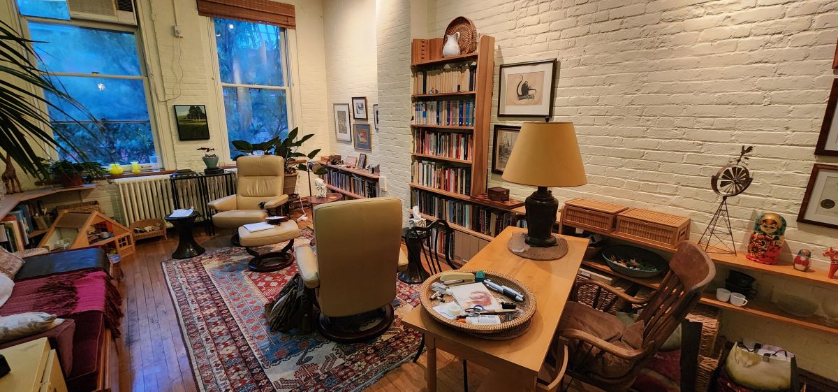 West Village office to share (photo below). Spacious (12’ x 18’), high ceilings, skylight, two tall windows ensure ventilation and provide unusual brightness but little direct sunlight. Pleasant, tree-lined block. AC, electricity, wifi, exclusive refrigerator included. Lg. windowed waiting room, allows social distancing (photo below). Covid Protocols observed throughout the suite of five offices. Kitchenette (microwave, refrigerator, coffee maker, water cooler). Nicely proportioned three story building (photo below); third floor walkup. Entire building interior is architect designed and rented to professionals. 13th Street, between 7th & 8th Avenues, convenient to 14th St.: several subway hubs, Path and L trains. Available weekends and Mondays all day, as well as Thursday and Friday mornings. Reach out for rates. For further info pls contact me at email below.
