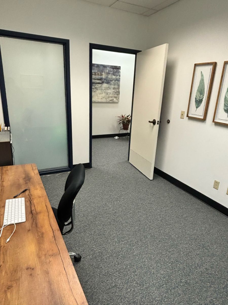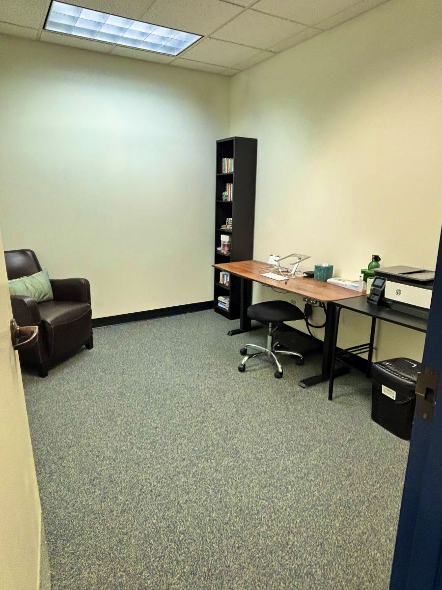 Unfurnished office (11.11 x 9.4 dimensions) for mental health clinician available for short term sublease (e.g. 6 or 9 month). Space is part of office suite (1250 sq) utilized by 3 psychologists in private practice. Separate waiting room, separate conference room, kitchenette, internet access, AC, large parking lot for clients.